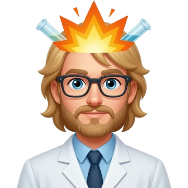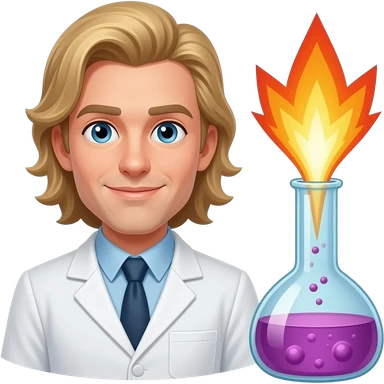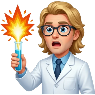 male scientist with long blond hair and no beard wearing googles experiencing a flask explosion emoji | AI Emoji Generator