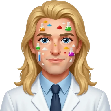 clean shaven blonde male scientist with hair to his waist and substances on his face emoji