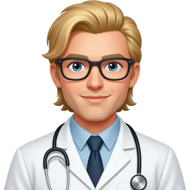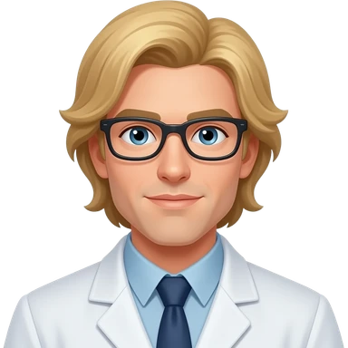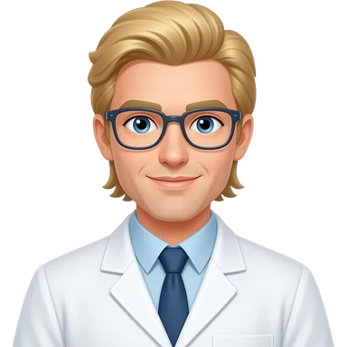 3D character memoji, male scientist, white skin, light blond parted hair, golden round glasses, wearing white lab coat and blue shirt, soft smiling expression, soft volumetric studio lighting, centered portrait against solid dark black background. emoji