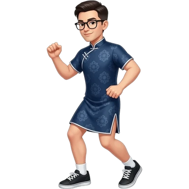 male with glasses in short cheongsam dress and dancing sneakers. show whole body profile emoji