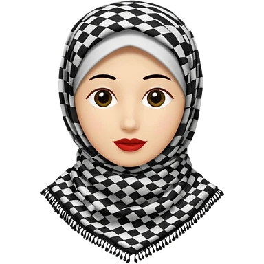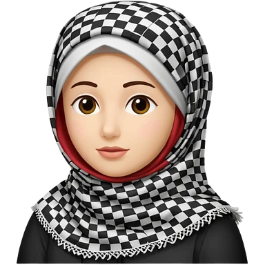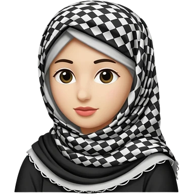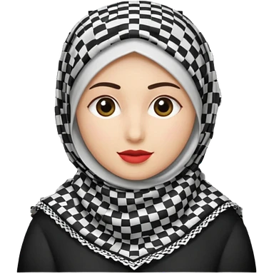 The image features a young woman wearing a black and white keffiyeh wrapped around her head and draped over her shoulders. She has a serious yet confident expression, with full lips slightly pursed and lashes. Her outfit consists of dark clothing. emoji