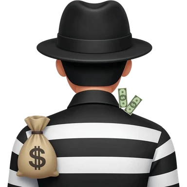 A stealer emoji whit a bag of money behind and. A stealer mask whit a hat and striped black and white shirt emoji