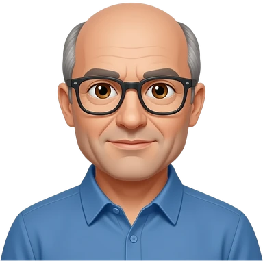 PD - man, brown eyes, early 60s, bald with grey hair on side of head, blue shirt and glasses emoji