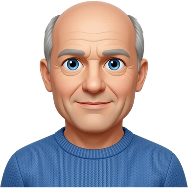 PD - man, blue eyes, early 60s, bald with grey hair on side of head, blue jumper emoji