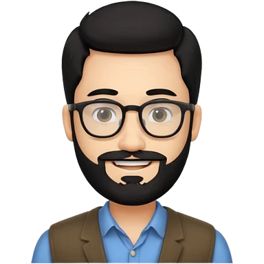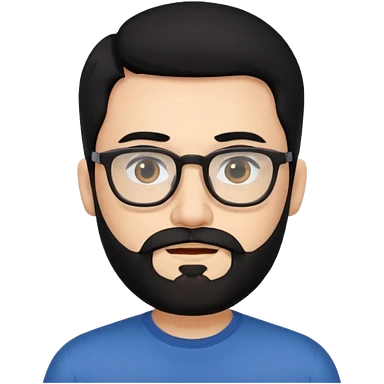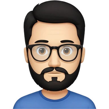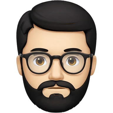 Man, hispanic skin, black hair, black beard, black mustache black eyes black t hoodie, small nose, long emo hair, muscular , round glasses emoji