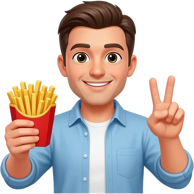 Man holding fries in one hand and peace sign with the the other emoji