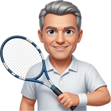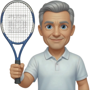 man, 60s aged, short grey hair, blue eyes, tennis racket in right hand emoji