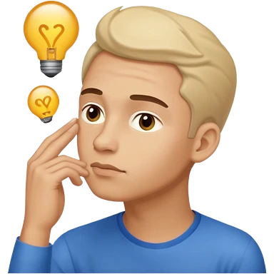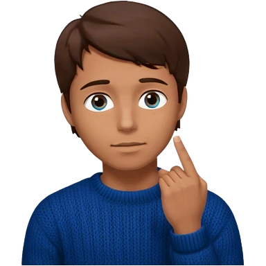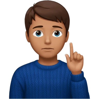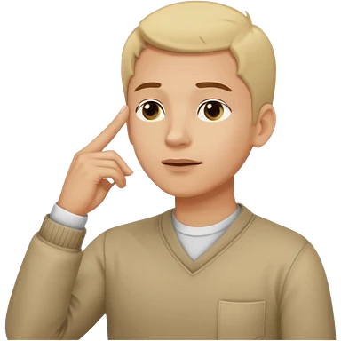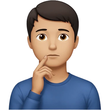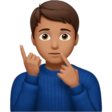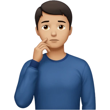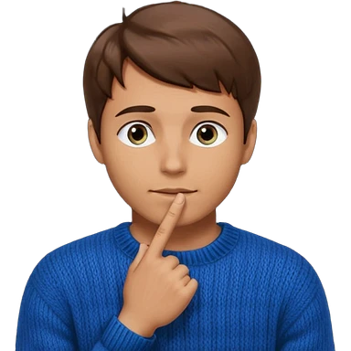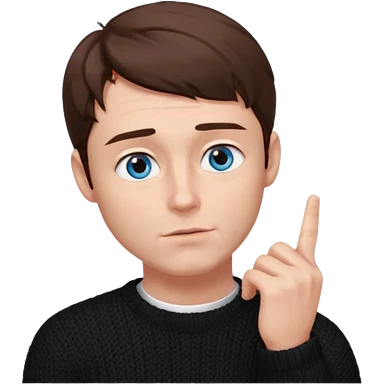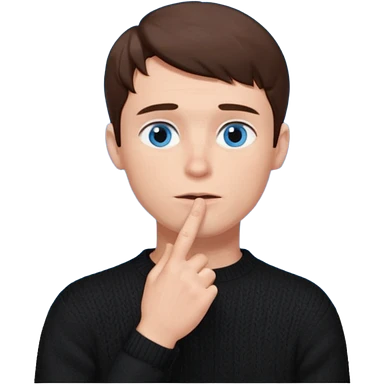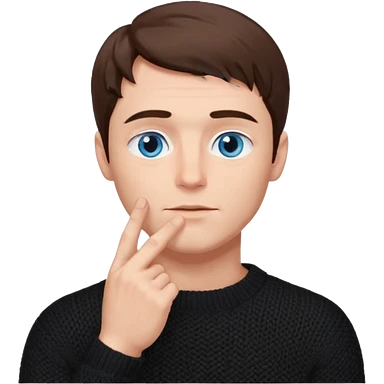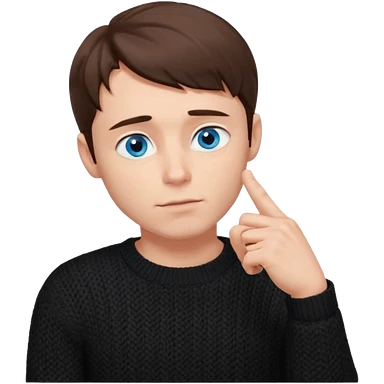 man in black knitted sweater in thinking pose, blue eyes brown hair, index finger touching his chin, eyes looking up to the top right emoji