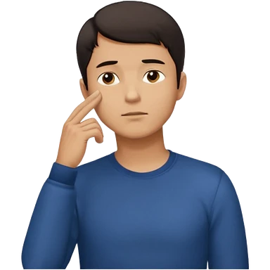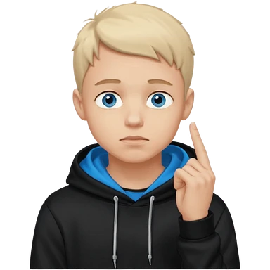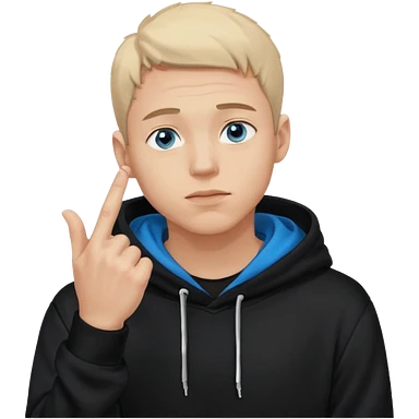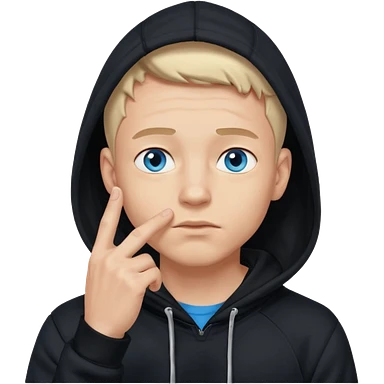 man in black hoodie in thinking pose, blue eyes, right hand raised, index finger touching his chin, eyes looking up to the top right emoji
