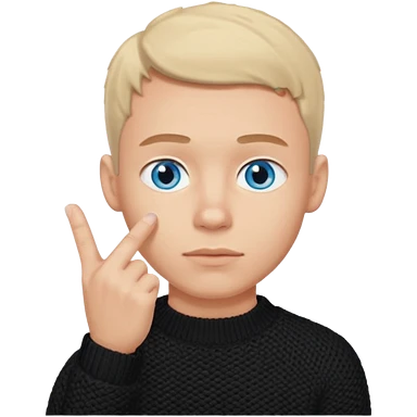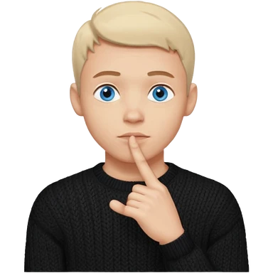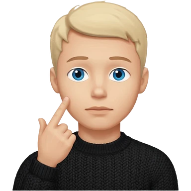 man in black knitted sweater in thinking pose, blue eyes, index finger touching his chin, eyes looking up to the top right emoji
