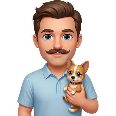Man with dark blond hair, mustaches, Blue eyes, holding a petite female dog emoji
