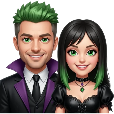 Man and woman with mischievous smiles and green eyes, funky hairstyle and gothic emoji