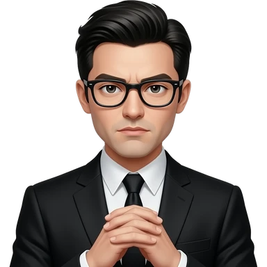 Man with dark hair and black glasses, black suit and serious expression presswith is fingers touching each other. Gothic emoji