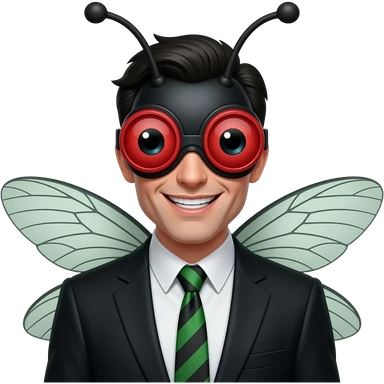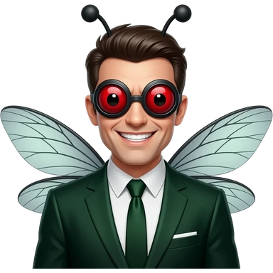 Man in creepy fly costume emoji, red compound eye goggles, dark green/black suit, tiny hairs, wings behind head, evil grin, glossy emoji style, centered, clean background emoji