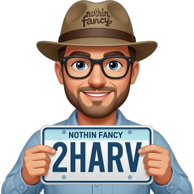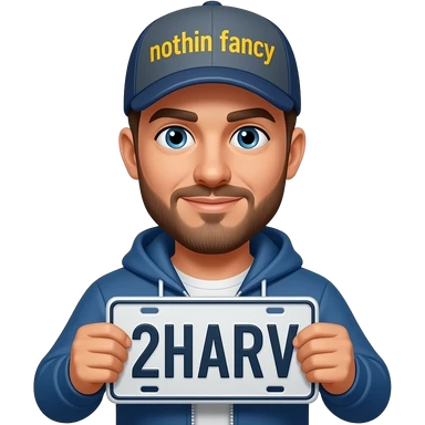 Man with license plate that says 2HARV with a hat that says nothin fancy emoji