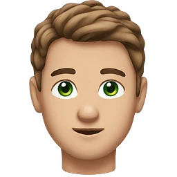 White man with freckles and rectangular glasses, short dark chestnut hair on the sides and long curls on top. Green/Blue eyes. And a big cheerful smile emoji