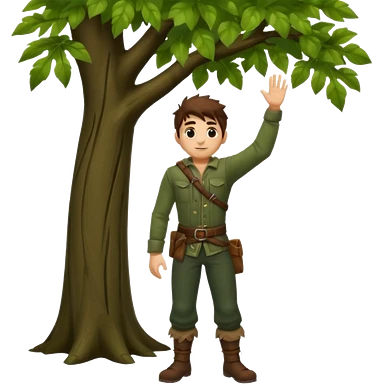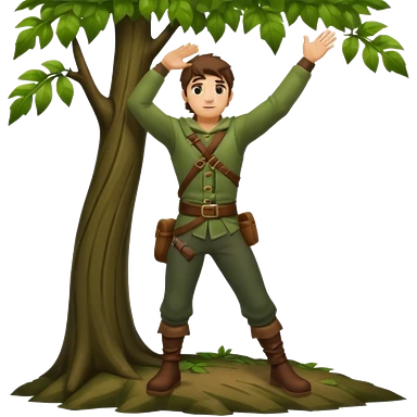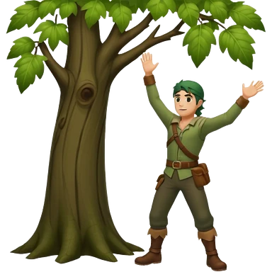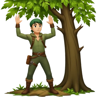 full body forest rogue man, from behind leaning against tree, one arm raised, leaf shadows on back emoji