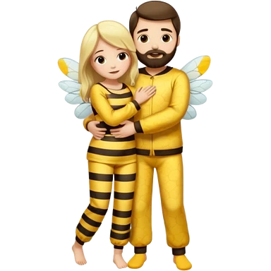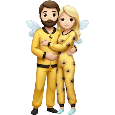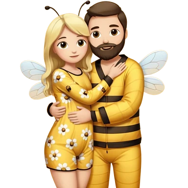 Man long dark brown hair, white skin, medium beard, full body in cute bee pijama hugging a woman with blonde hair in a flower suit emoji