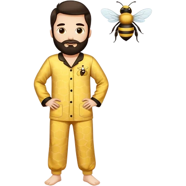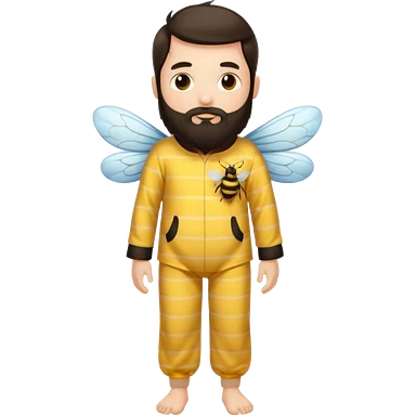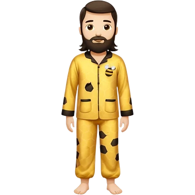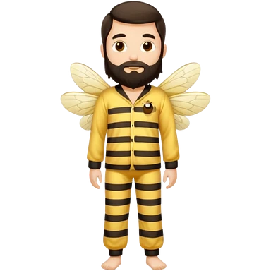 Grown up man with long dark brown long hair, white skin, medium beard, full body in cute bee pijama emoji