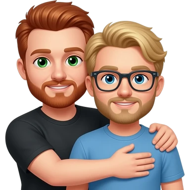 man with short red hair and green eyes, short beard hugging his partner who has blond hair and short beard, more oval shape head and wears glasses emoji