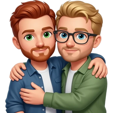 man with short red hair and green eyes, short beard hugging his partner who has blond hair and short beard and wears glasses emoji