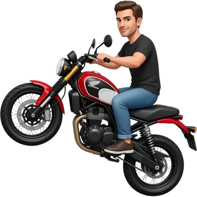 A middle age man “wheelie” the motorcycle honda Red 250 cc 1985 emoji
