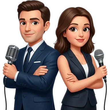 a man and a women with their backs togrther arms folded hosting with a mic and formal fit emoji