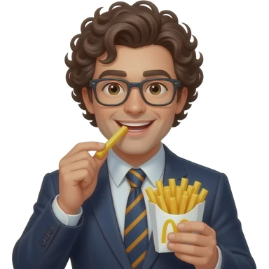 curly hair man with suit with specs eating french fries emoji