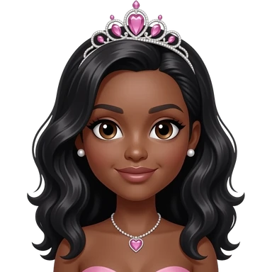 Dark brown skin, Doll shaped face, doll eyes, pink tiara, wavy with side part longer black hair, heart diamond necklace, no bra, Pearl earrings studs emoji
