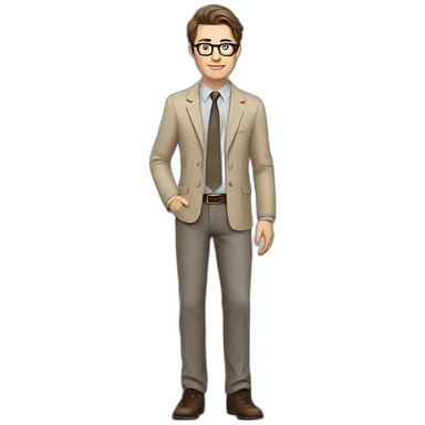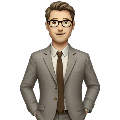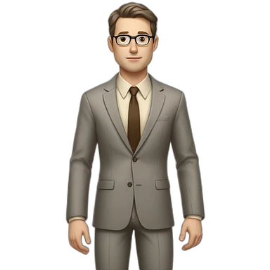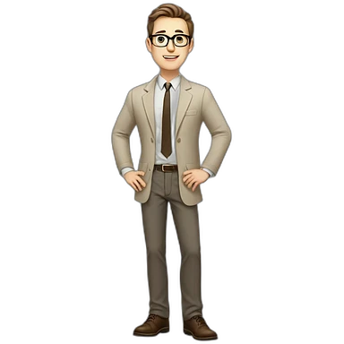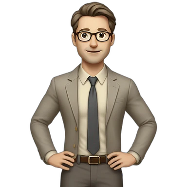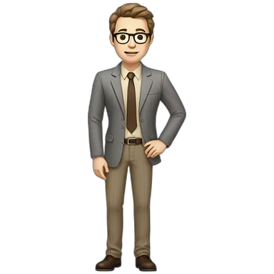 Full height Actively Gesturing Pale skinned fit man with dark brown hair in gray jacket, beige office shirt, brown tie, brown pants and vintage glasses. emoji