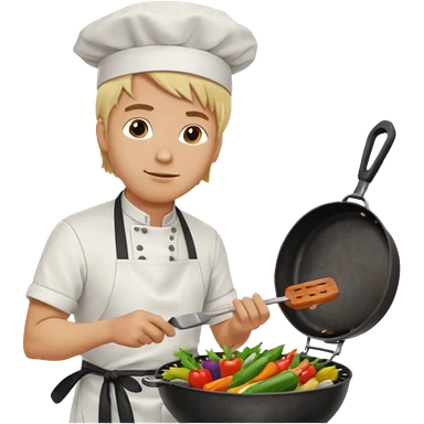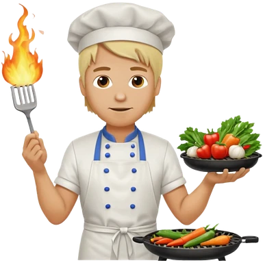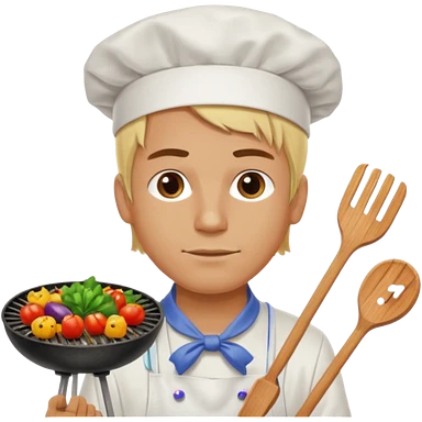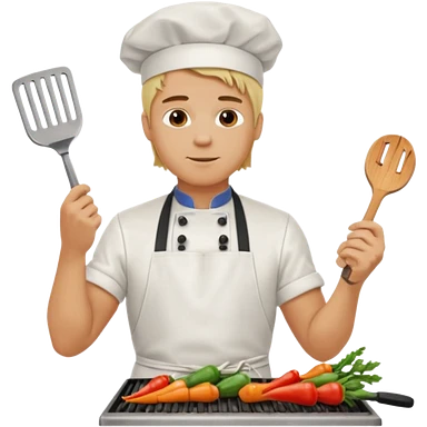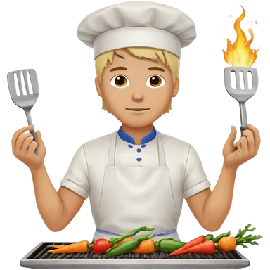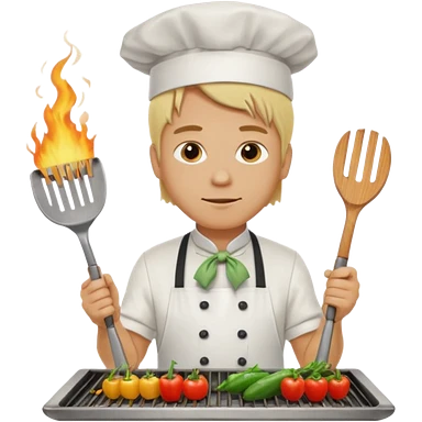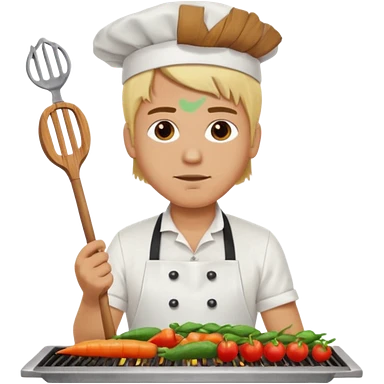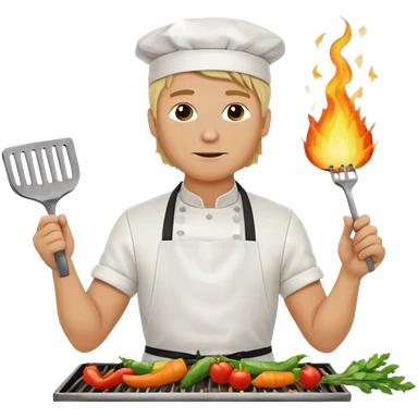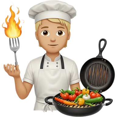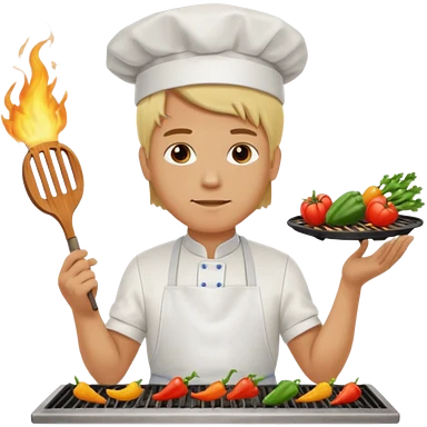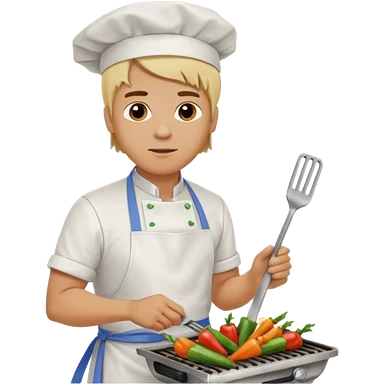 man with tied blond hair and and a white apron grilling vegetables on a sizzling grill emoji