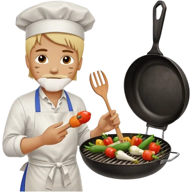 hippo man with tied blond hair and and a white apron grilling vegetables on a sizzling grill emoji