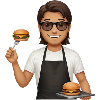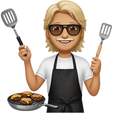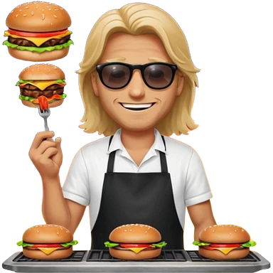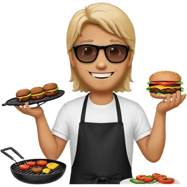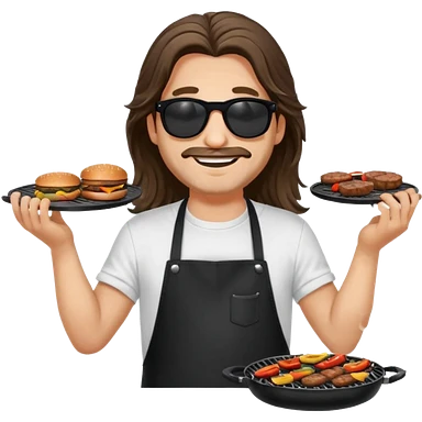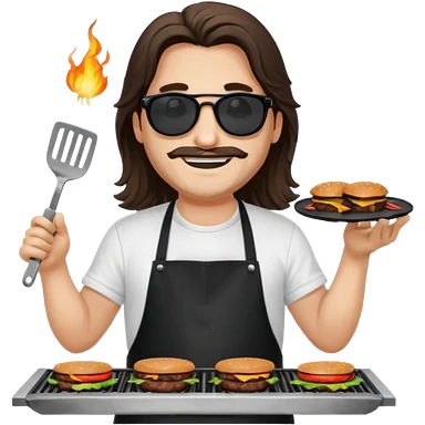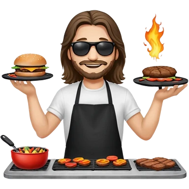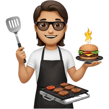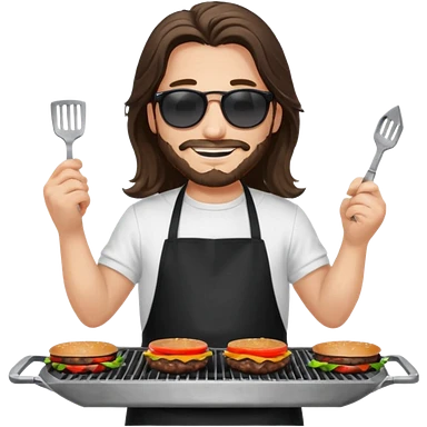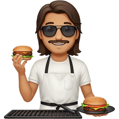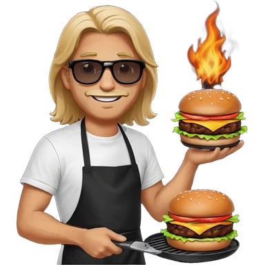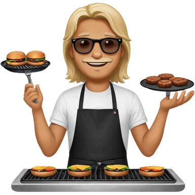 long hair man grilling wearing shade smiling in a white tshirt and a black apron grilling burger and meat on a sizzling grill emoji