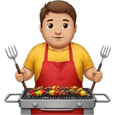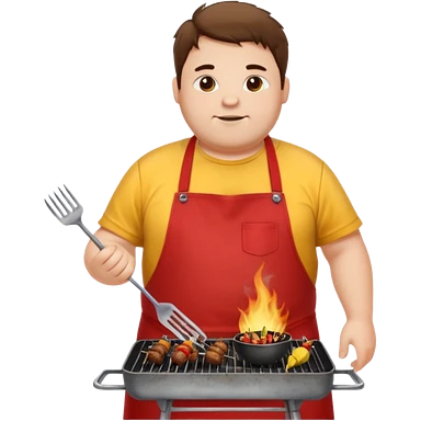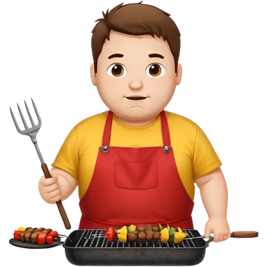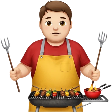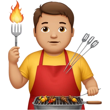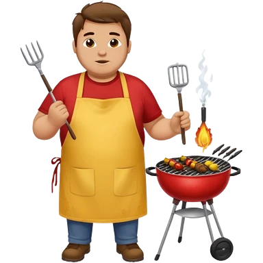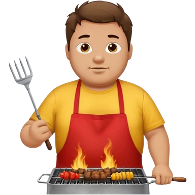 chubby man messy hair and dirty yellow shirt and a red apron grilling bbq and skewers on a sizzling grill emoji