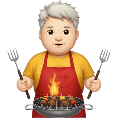 chubby man white messy hair and dirty yellow shirt and a red apron grilling bbq and skewers on a sizzling grill emoji