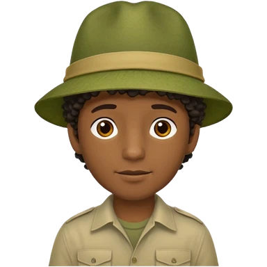 A dark colored man in a jungle with little curly hair on his head under hit jungle hat emoji