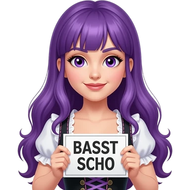 sexy girl with long purple hair and purple eyes wearing a dirndl holding a BASST SCHO sign emoji