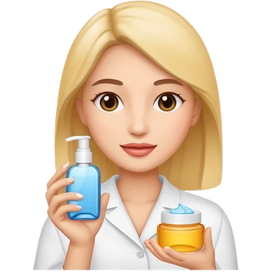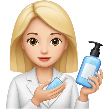 blonde man with white coat and glasses holding skincare products emoji