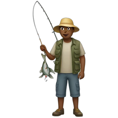 White man on a boat heading right with a fishing rod with a huge hook emoji