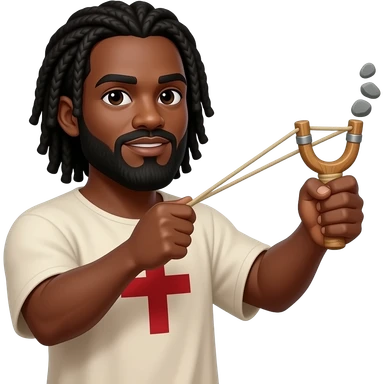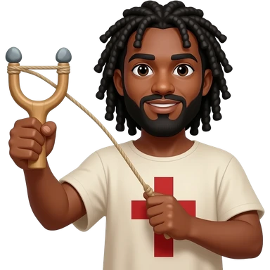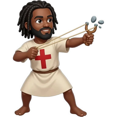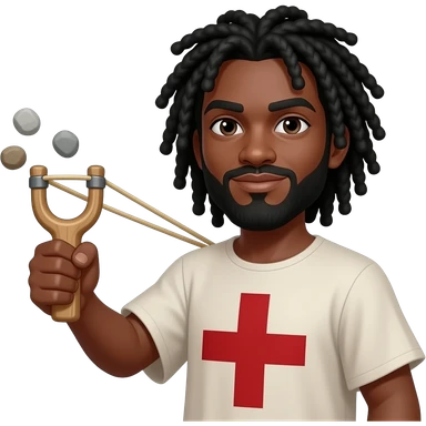 African American man with shoulder length black dreadlocks and black beard wearing a tunic with a red cross on it swinging a slingshot with 3 stones in it emoji