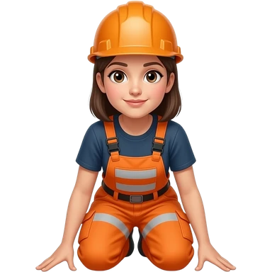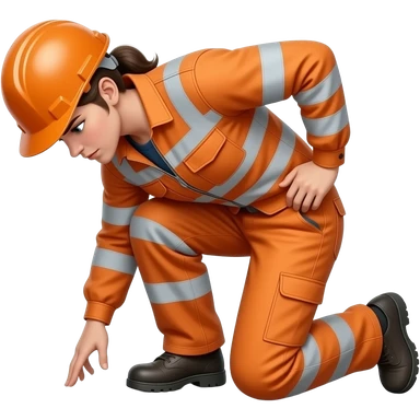 woman, in full orange hi-vis overalls with sleeves and hard hat, looking at floor emoji