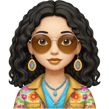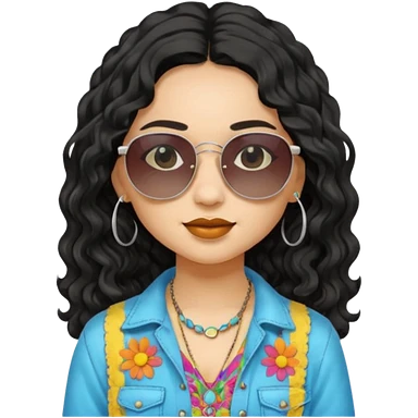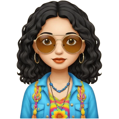 girl in hippies clothes, wearing sunglasses, black wavy hair emoji