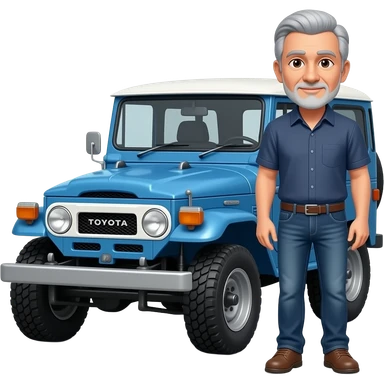 Toyota fj40 Land Cruiser emoji style with receding grey hair man in jeans and short sleeve shirt stand next to blue fj40 emoji