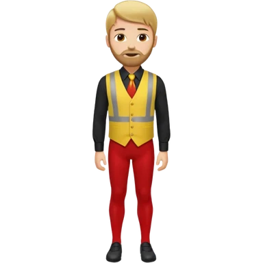 A blond man wearing a black dress shirt, red tights, and a yellow tie. A red vest over his black shirt. A blond man with brown hair and a short beard. His outfit consists of a black shirt, a red vest over it, and a yellow tie. (no white in clouth) emoji