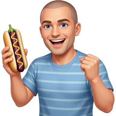 White man with shaved head celebrating a win with an eggplant hot dog emoji