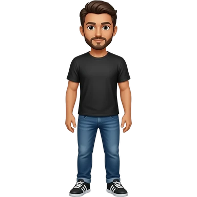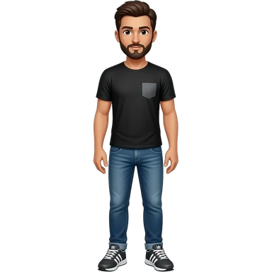 standing male, medium skin tone, dark brown hair, short beard and mustache, standing, wearing jeans, a faded black / gunmetal gray t-shirt and jeans and adidas shoes emoji