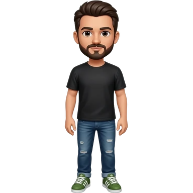 standing male, medium skin tone, dark brown hair, short beard and mustache, standing, wearing jeans, a faded black / gunmetal gray t-shirt and jeans and olive green adidas shoes with white stripes emoji