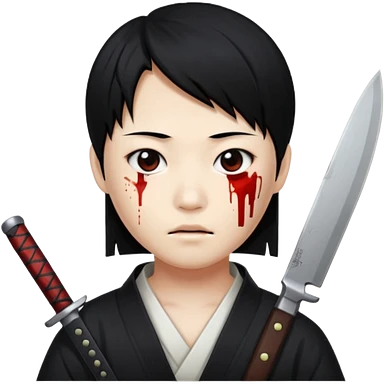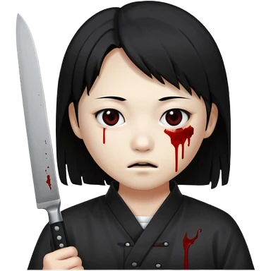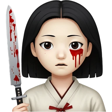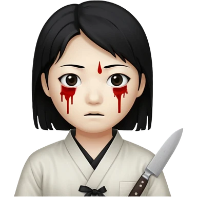 Korean murderer white skin with Asian eyes and holding kitchen knife with black straight hair with also one eye is blind covered with blood emoji