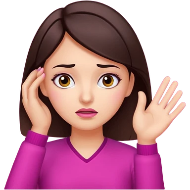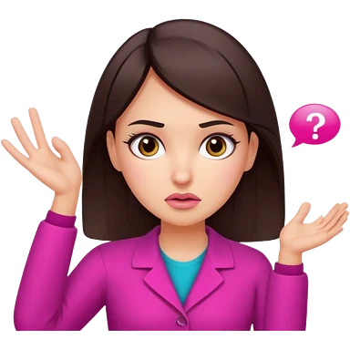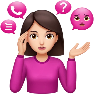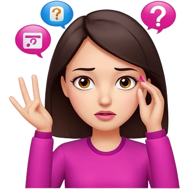 Social media manager. She has dark brown hair, brown eyes, , confused expression, raised eyebrows, questioning face, one hand on the head as if not understanding analytics.. Use vibrant colors with a focus on pink and fuchsia tone emoji
