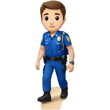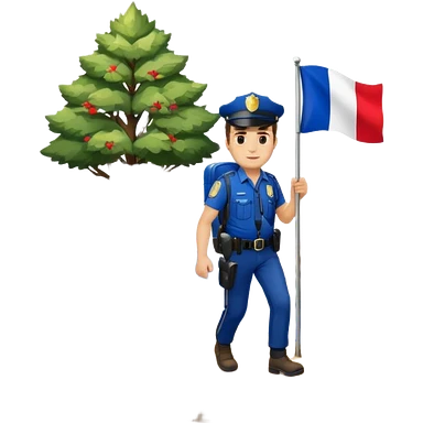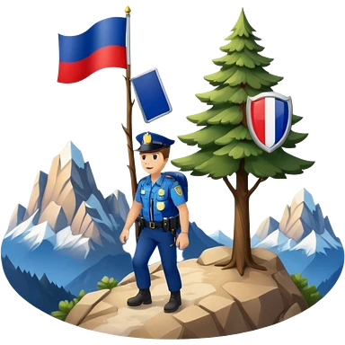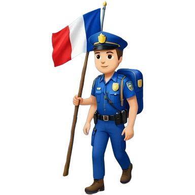 Adventurous man hiking with a police badge with mountains in the background. The French flag is on a tree emoji